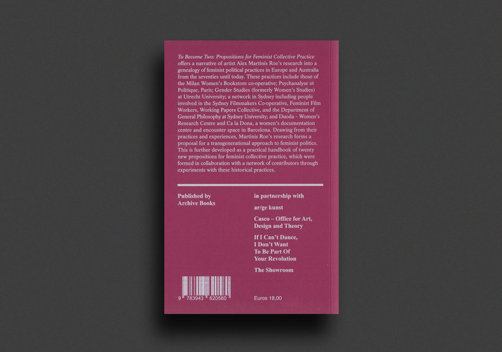 To Become Two: Propositions for Feminist Collective Practice offers a narrative of artist Alex Martinis Roe’s research into a genealogy of feminist political practices in Europe and Australia from the seventies until today. These practices include those of the Milan Women’s Bookstore co-operative; Psychanalyse et Politique, Paris; Gender Studies (formerly Women’s Studies) at Utrecht University; a network in Sydney including people involved in the Sydney Filmmakers Co-operative, Feminist Film Workers, Working Papers Collective, and the Department of General Philosophy at Sydney University; and Duoda – Women’s Research Centre and Ca la Dona, a women’s documentation centre and encounter space in Barcelona. Drawing from their practices and experiences, Martinis Roe’s research forms a proposal for a transgenerational approach to feminist politics. This is further developed as a practical handbook of twenty new propositions for feminist collective practice, which were formed in collaboration with a network of contributors through experiments with these historical practices.