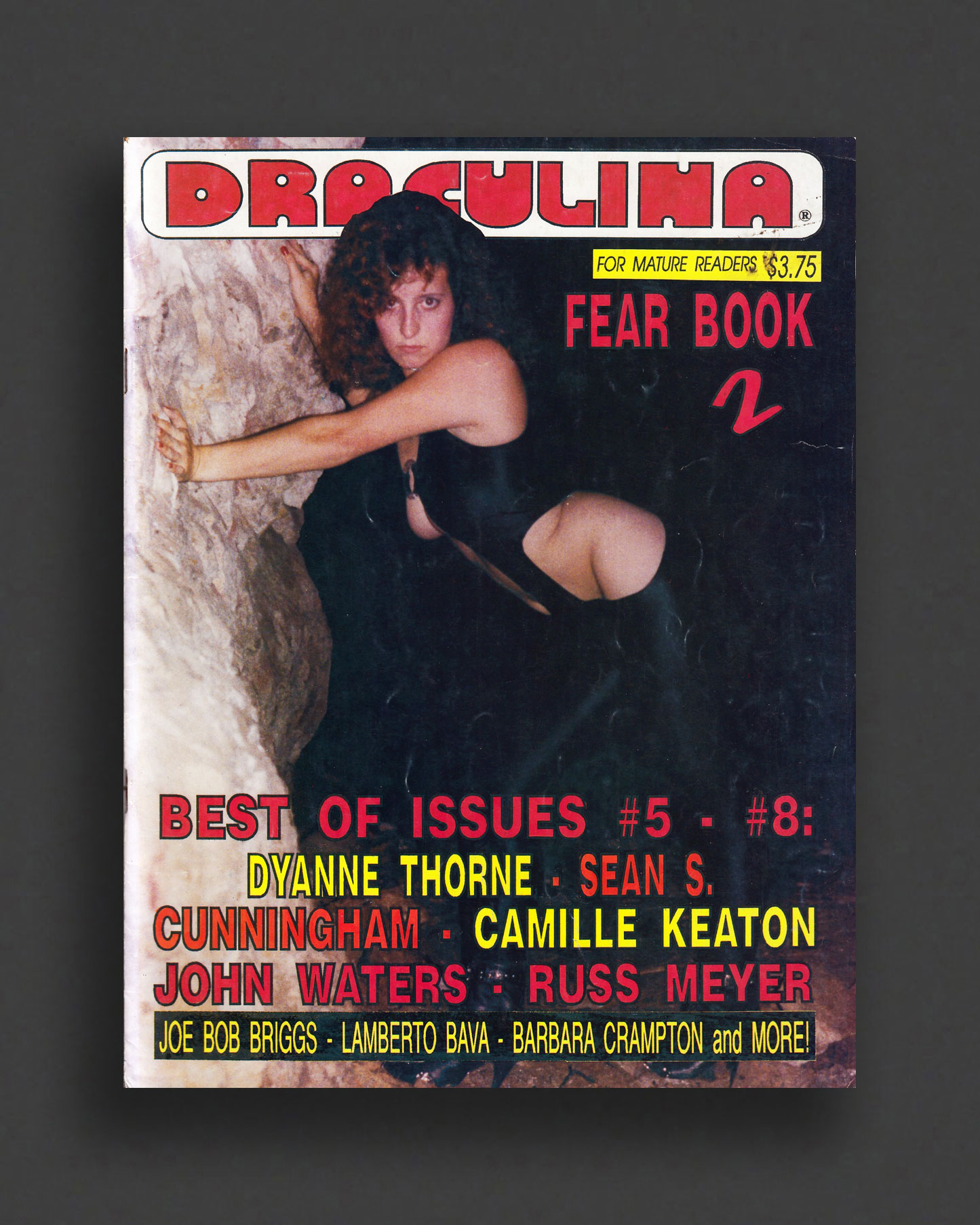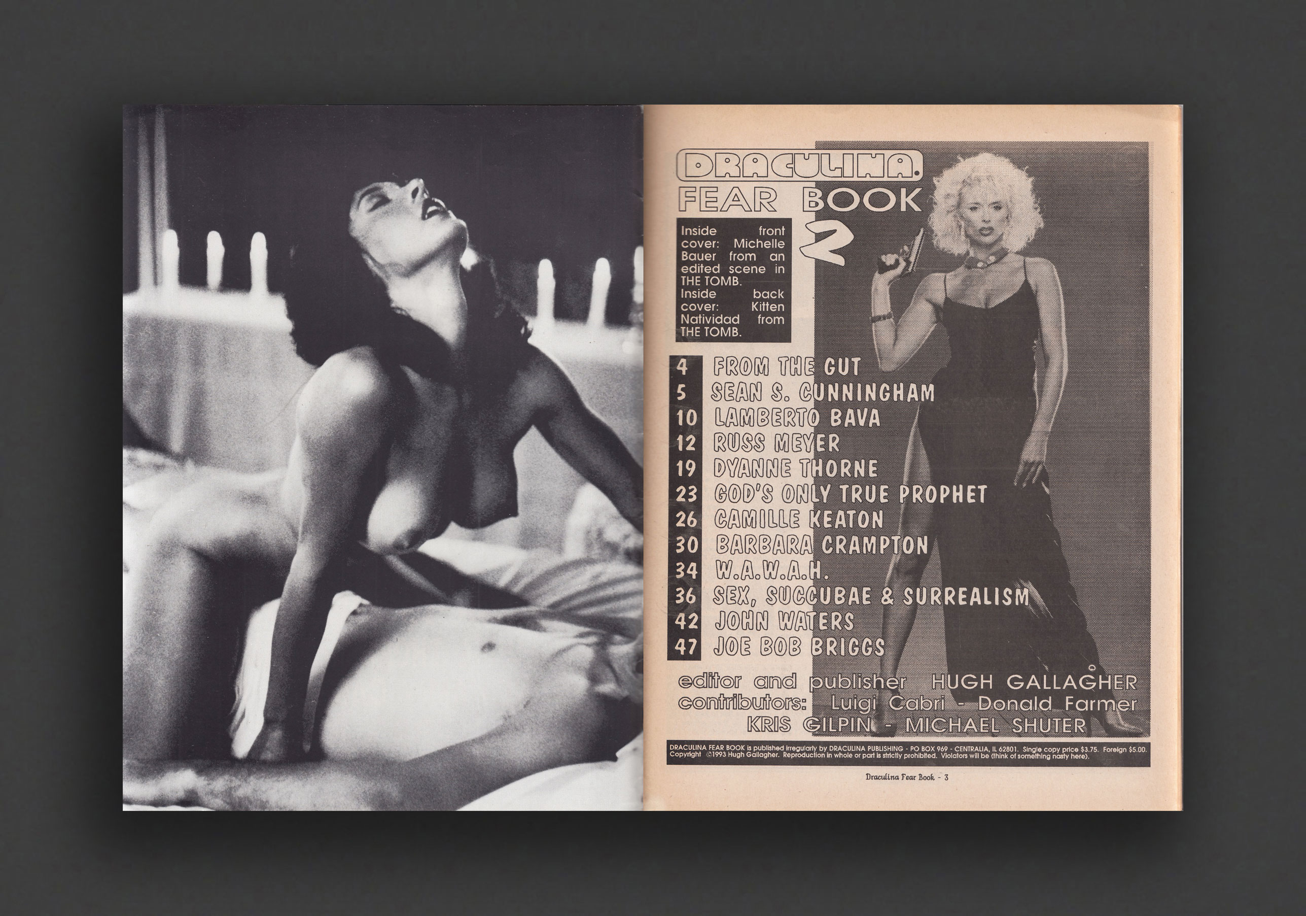 Second 1993 issue of Draculina Fear Book, edited and published by Hugh Gallagher of Draculina Publishing, an independent publishing company that, inspired by Hammer horror movies, produced hundreds of magazines, comics and books devoted to the intersection of smut and gore, the beautiful women of horror, and the cinematic world of schlock/gore/trash/exploitation/transgression. Beyond the abundance of photographs of vixens, vampiresses, she-wolves, scream-queens and she-devils, is a goldmine of interviews with and features on Lamberto Bava (Demons, Inferno, A Blade in The Dark, Tenebre, etc) , Russ Meyer (Faster, Pussycat! Kill! Kill! Vixen!, Beyond the Valley of the Dolls, etc.), John Waters (Pink Flamingos, Polyester, etc.), Sean S. Cunningham (The Last House on the Left, Friday the 13th, House, etc.), Dyanne Thorne (Ilsa, She Wolf of the SS), Camille Keaton (I Spit on Your Grave), Barbara Crampton (From Beyond, The Reanimator, Chopping Mall, etc.), articles on "Sex, Succubae, and Surrealism" (Rollin, etc.), girl-on-girl cat fight entertainment, and much more.