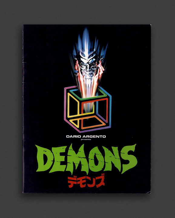 Wonderful, rare Japanese souvenir photo booklet for Demons, a 1985 Italian horror masterpiece directed by Lamberto Bava, son of "Master of Italian Horror" Mario Bava, produced by Dario Argento, written by Dardano Sacchetti, with screenplay by Argento, and starring Urbano Barberini and Natasha Hovey. A group of young people (along with a blind man and his guide daughter, a pimp and two prostitutes, etc.) are trapped in a large West Berlin movie theatre infested with ravenous demons whom proceed to kill and posses people to the sounds of heavy metal music, multiplying their numbers. Punks break in and things get worse. A classic of Italian new wave horror. Heavily illustrated throughout with glossy colour and b/w stills from the film, alongside texts in Japanese about the film, cast, and production information.