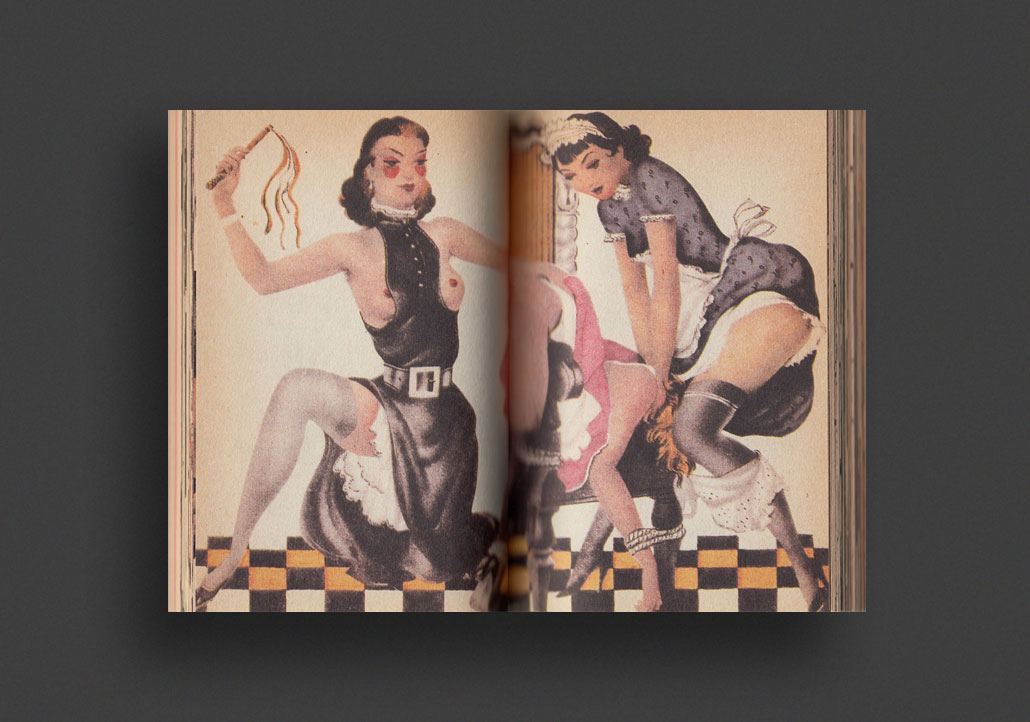 Amazing pocket art book of Bizarre Bondage Fashion, edited by Makoto Ohrui and Japanese novelist Mari Akasaka (both editors of SALE2/Fiction Inc.) and published in Tokyo Japan by Futami Shobo in 1991. Packed cover-to-cover with colour and b/w reproductions of classic artworks by John Willie, Irving Klaw, ENEG, Carlo, Jim, Eric Stanton, E.K., Ruis, Betty Page, and many more garnered from the underground bounty of European and American Fetish and Bizarre publications. Perfectly compiled in the way SALE2 did so well, with elegant scrapbook style, dense with imagery, blown-up, full-bleed reproductions from many publications. Includes a multi-panel double-sided pull-out by John Willie.