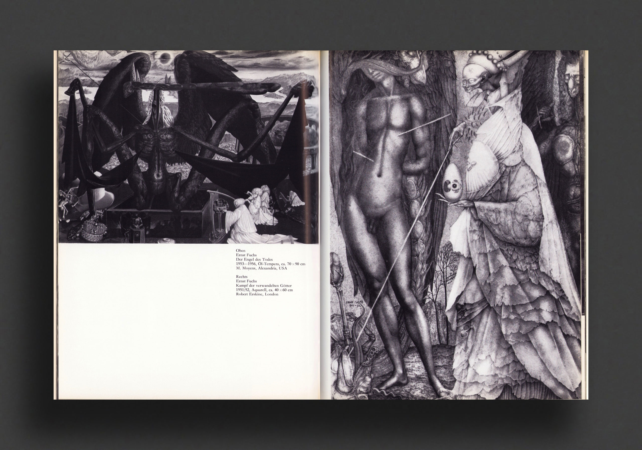 Lovely catalogue published in 1981 by Nürnberg Archiv für bildende Kunst, showcasing the early works of a number of the leading members of the Vienna School of Fantastic Realism — Erich Brauer, Ernst Fuchs, Rudolf Hausner, Wolfgang Hutter, Fritz Janschka, along with Austrian film director and avant-garde artist Kurt Steinwendner. A number of works are illustrated by the featured artists, in b/w. Includes essay by Austrian art critic Johann Muschik and full catalogue of the exhibited works by each artists.