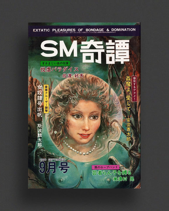 SM Kitan September 1980 issue, featuring cover artwork by legendary erotic fantasy artist Ran Akiyoshi (1922–1982). A cult classic of vintage Japanese BDSM and Kinbaku (Japanese bondage), SM Kitan was a leading SM magazine published by the great Sun Publishing house, and was formerly known as S&M Abuhunter (changing its name to SM Kitan from August 1975). Heavy with wonderful artwork galleries in colour and bw, glossy bondage photo-features, illustrated fetish fiction, manga, fold-outs, and much more. Ran Akiyoshi (1922–1982) illustrated many of the iconic covers, with regular contributors including Sotaro Aki, Tadao Chigusa, Namio Harukawa, Yoko Ozuma, Reiko Kita, Akiyoshi Akiyoshi, Hakuzan Shiraishi, Shoji Oki, Namio Harukawa, Akira Kasuga, and Gekko Hayashi (Gojin Ishihara).