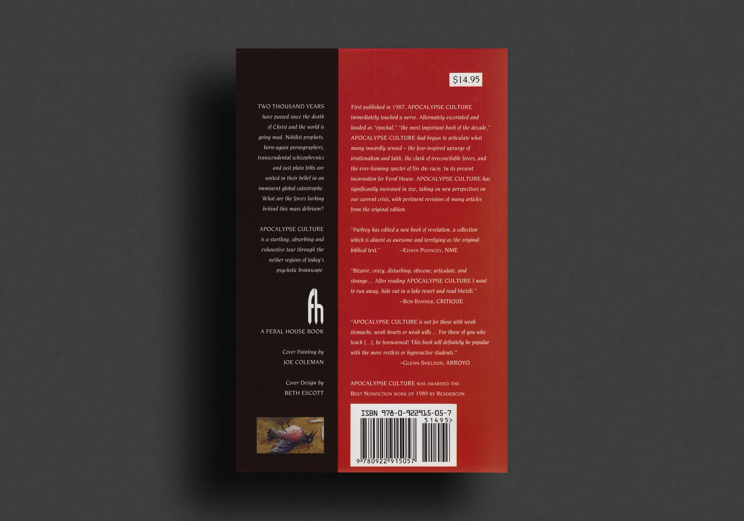 First published in 1987, APOCALYPSE CULTURE immediately touched a nerve. Alternately excoriated and lauded as “epochal”, “the most important book of the decade,” APOCALYPSE CULTURE had begun to articulate what many inwardly sensed — the-fear inspired irrationalism and faith, the clash of irreconcilable forces, and the ever-looming specter of fin de race. In its present incarnation for Feral House, APOCALYPSE CULTURE has significantly increased in size, taking on new perspectives on our current crisis, with pertinent revisions of many articles from the original edition.—burb from this expanded and revised 1990 edition.
