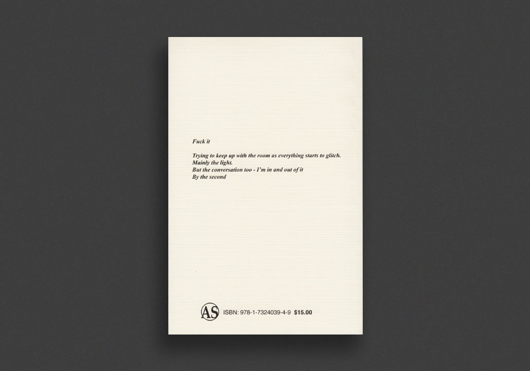 "Half our clothes are on the floor. The other half hang from the ceiling. Labyrinthine flesh-piles make a staircase. Polishing the soot off a breast with my sleeve, I dance horizontally. The band regurgitates into their instruments to slow the tempo, blowing catchy bubbles of sick. Sweat snows upward, stagnant when we see ourselves pooled within it, mosquitoes in a tin can. Vestigial, amoebic replications, abominable degenerations of the ape, totems fucked through stained glass. I toast the trash.