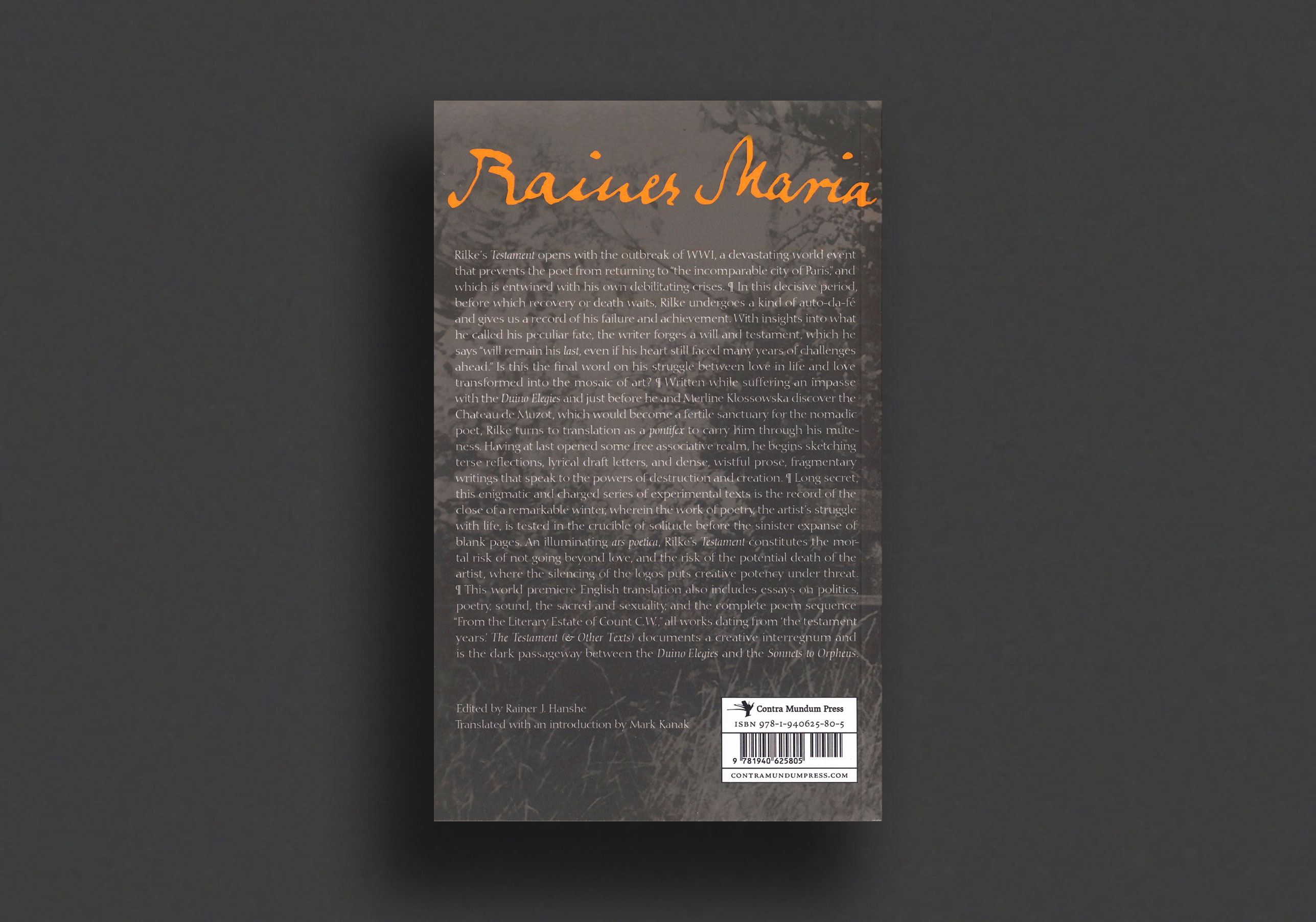 Long secret, this enigmatic and charged series of experimental texts is the record of the close of a remarkable winter, wherein the work of poetry, the artist’s struggle with life, is tested in the crucible of solitude and the sinister expanse of blank pages. An illuminating ars poetica, Rilke’s Testament constitutes the mortal risk of not going beyond love, and the risk of the potential death of the artist, where the silencing of the logos puts creative potency under threat.