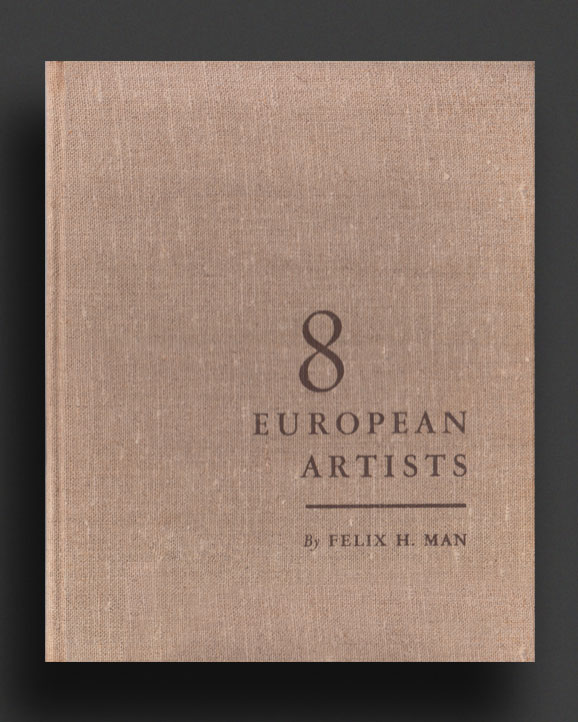 First buckram-bound edition of the oversized 8 European Artists published in 1954 by William Heinemann, London, Sydney, Toronto. Felix H. Man's photo documentary on eight masters of Modern Art: Georges Braque, Marc Chagall, Le Corbusier, Henri Matisse, Henry Moore, Pablo Picasso, Graham Sutherland. Each artist is represented through generous chapters made up of varying paper stocks of vivid kodachrome photographs 9colour and b/w) of the artist's at work in their studios, original contributions from each artist in the form of a drawing and a handwritten text reproduced in facsimile with translations, and a chronological biography. Photographs, foreword and book design by Felix H. Man; introductions by Graham Greene and Jean Cassou. Texts in English, French, German.
