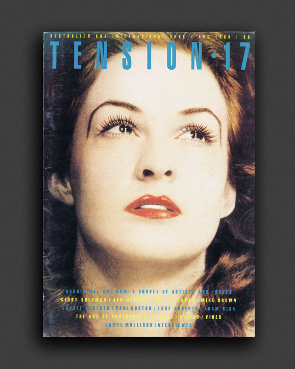 TENSION 17 (Australian and International Arts : August 1989) features articles on Mike Brown, Peter Halley, Cindy Sherman, Jon Cattapan, Jan Nelson, Paul Boston, Adam Rish, Carole Roberts, Luke Roberts, Carlo Mollino, "The Art of Photography", "Video", Horst, "The Designers' Designers" by Emma Dent Coed (on the art directors, designers, and visual marketing behind fashion designers such as Yohji Yamamoto, Dries Van Noten, John Galliano, Rei Kawakubo/Comme des Garcons, etc. inc. Peter Saville, Nick Knight, etc.), and "Aboriginal Art Now : A Survey of Artists and Issues", inc. the work of Gordon Bennett, Jarinyanu David Downs, Rover Thomas, Trevor Nickolls, Tim Johnson, a review by Lin Onus, and more.