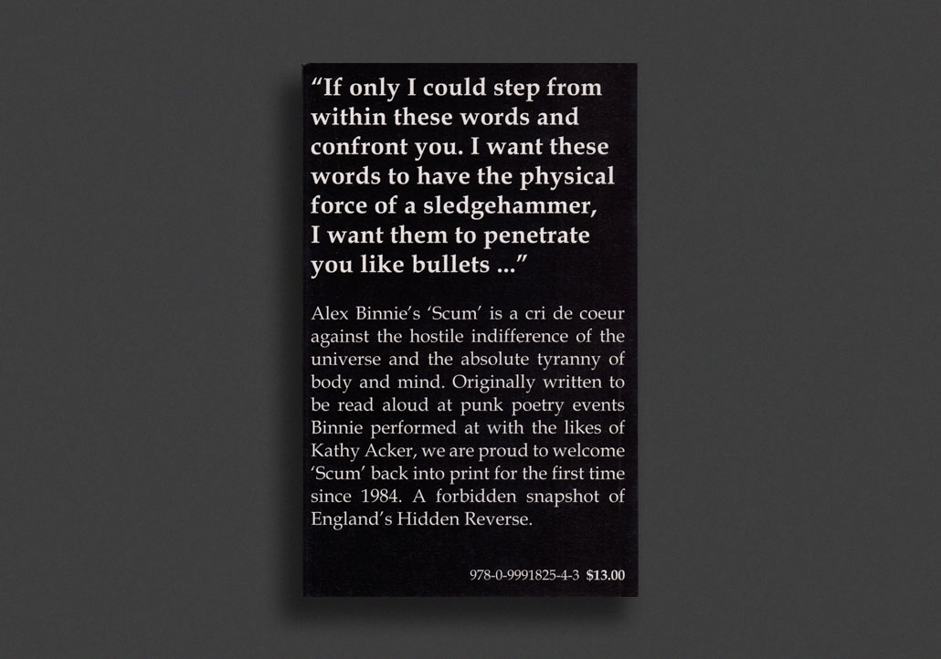 Originally written to be read aloud at punk poetry events Binnie performed at with the likes of Kathy Acker, we are proud to welcome Scum'back into print for the first time since 1984.