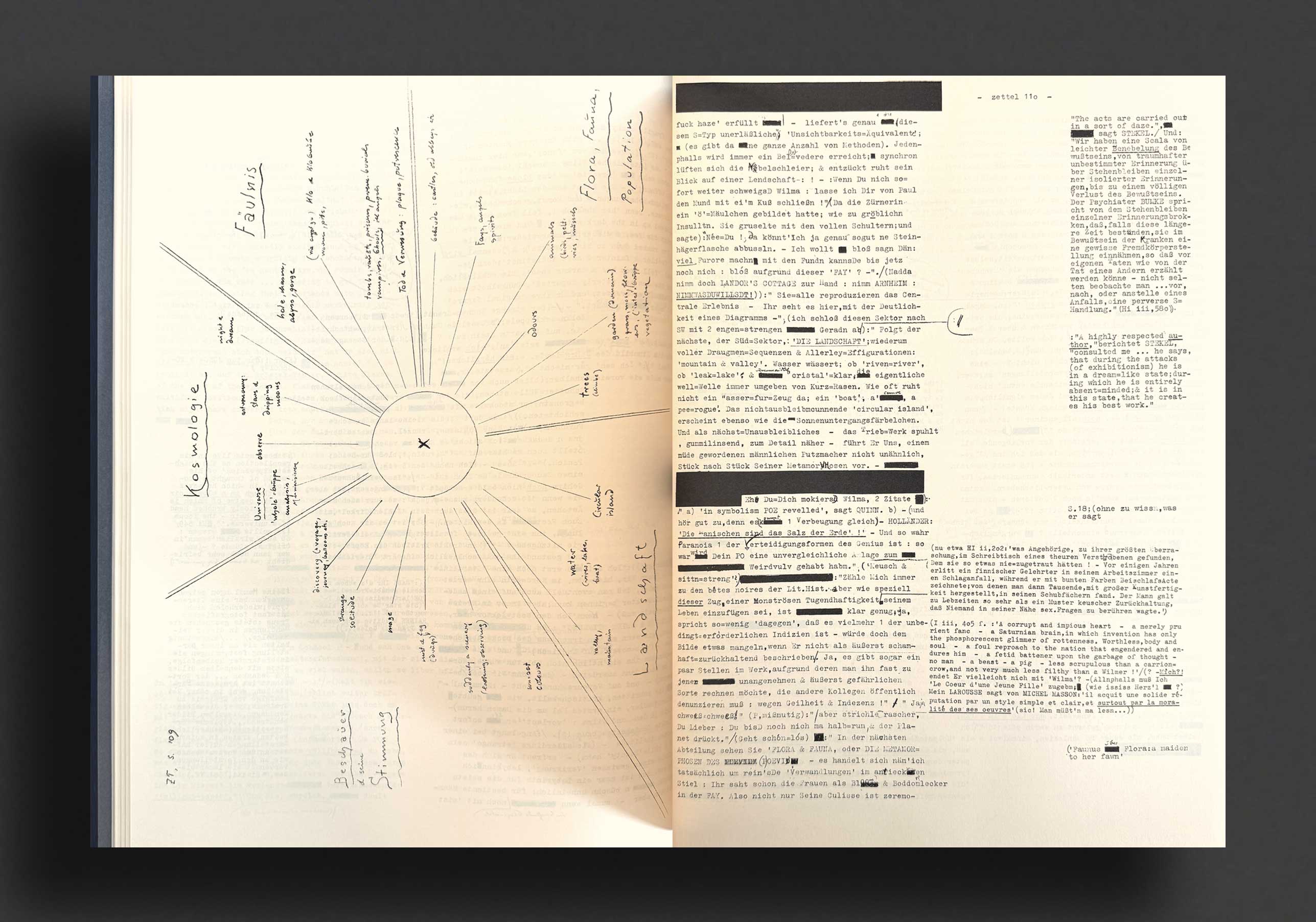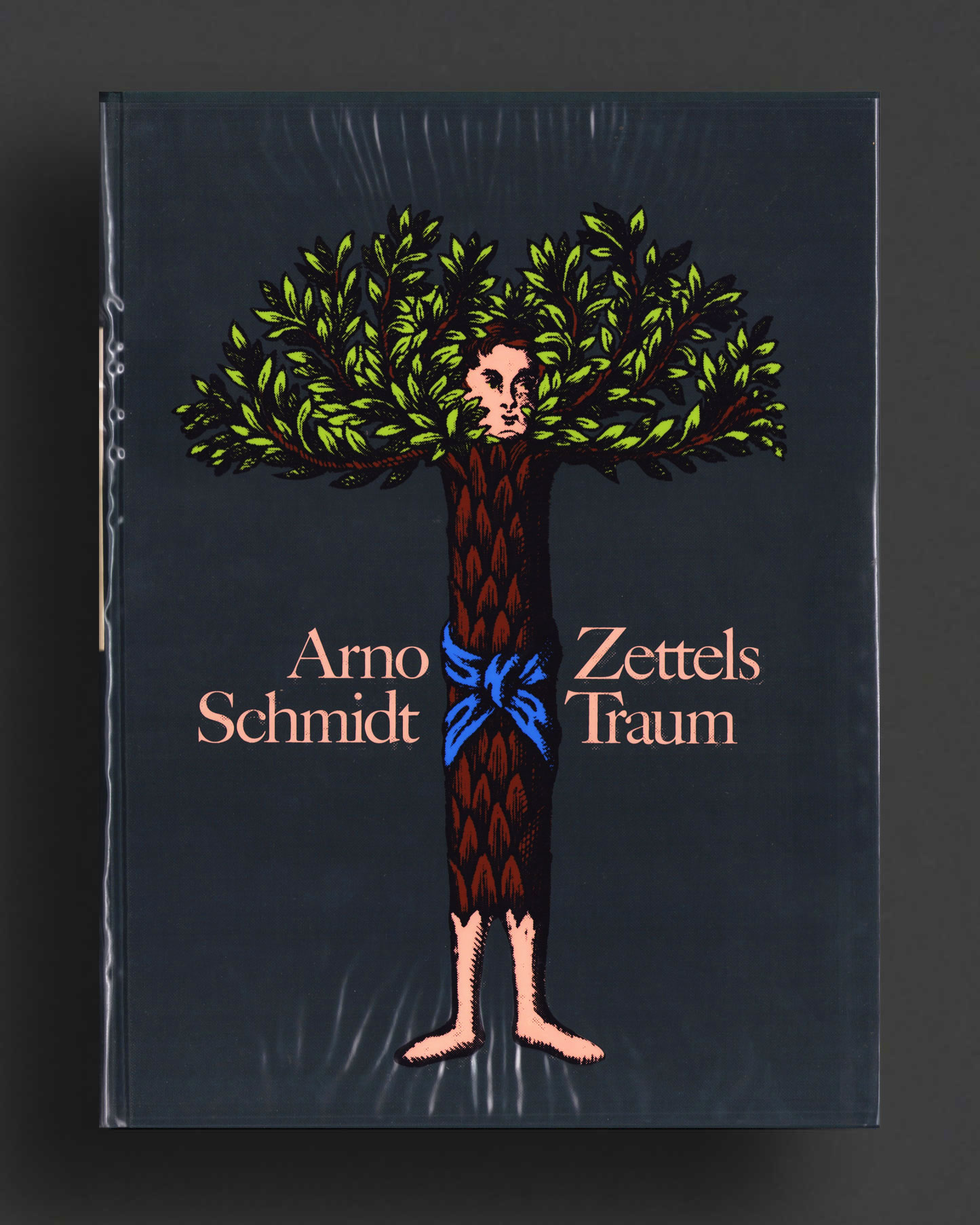 The stunning 1977 hard cover, slip-cased facsimile reproduction of Schmidt's epic manuscript of Zettel's Traum (Bottom's Dream), comprising 1334 leaves and published by S. Fischer Verlag, Frankfurt am Main. Since its publication in 1970 Zettel’s Traum/Bottom’s Dream has been regarded as Arno Schimdt’s magnum opus, as the definitive work of a titan of postwar German literature. Schmidt's gargantuan novel was published in this collector's facsimile folio format just as Schmidt created it — the un-type-settable story is told mostly in three shifting columns, presenting the text in the form of collages, typewritten pages and marginalia. Bound in cloth hardcover with wrap-around thick vinyl dust jacket with screen-printed colour artwork, in publisher's original cardboard slipcase with attached paper spine label, this edition of Schmidt's "superbook" presents the reader with it's true character, beautifully reproduced on warm paper stock.