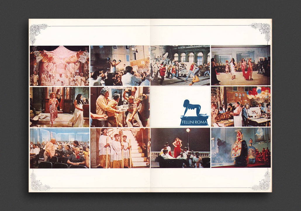 Wonderful, scarce Japanese souvenir photo booklet for Federico Fellini's Roma, a 1972 semi-autobiographical comedy-drama film depicting director Federico Fellini's move from his native Rimini to Rome as a youth. A homage to the city, the only major "character" of the film, Rome is a fluid, often chaotic tapestry of bizarre scenes, Roman lives and events that blend together into a gorgeous visual carnival. From the opening traffic jam into the city under the fascist reign of Mussolini, the film is a procession of raucous and extravagant aspects of both Rome's past and present in joyous, delirious Fellini style. Heavily illustrated throughout with glossy colour and b/w stills from the film, alongside texts in Japanese about the film, cast, and production information.