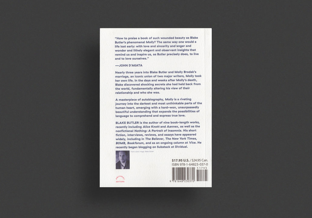 Unrelentingly clear, honest and concise, Molly approaches the impossible directly, with a total empathy that has no parallel or precedent. A supremely important work that will be taught, loved, relied on and passed around for years to come, Blake Butler affirms now beyond question his position at the very top rank of writers.