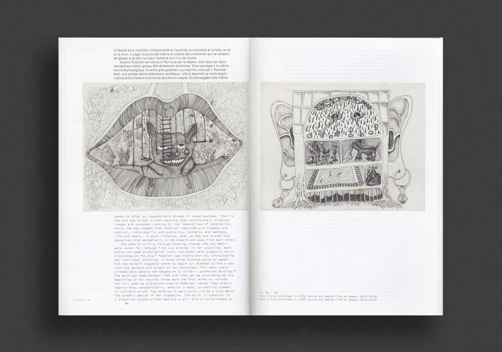 The exhibition and catalogue emphasizes her visual work and very personal iconography in order to bring it out of the shadows. The exhibition presents more than a hundred works on paper, made in Indian ink, pastel and colored pencil, alongside her early engravings and the original manuscript of her unique book, all documented in the catalogue.