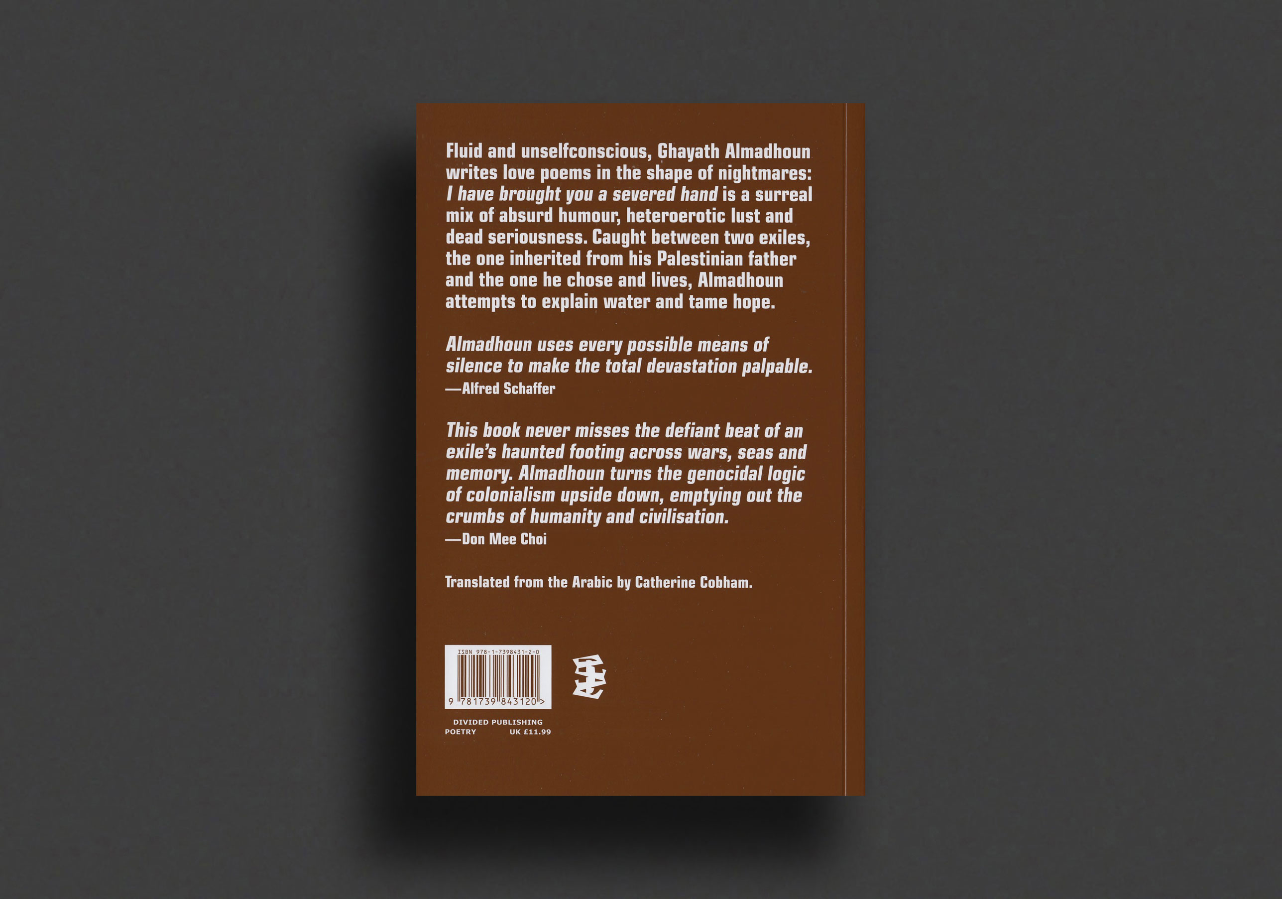 Fluid and unselfconscious, Ghayath Almadhoun writes love poems in the shape of nightmares: I have brought you a severed hand is a surreal mix of absurd humour, heteroerotic lust and dead seriousness. Caught between two exiles, the one inherited from his Palestinian father and the one he chose and lives, Almadhoun attempts to explain water and tame hope.