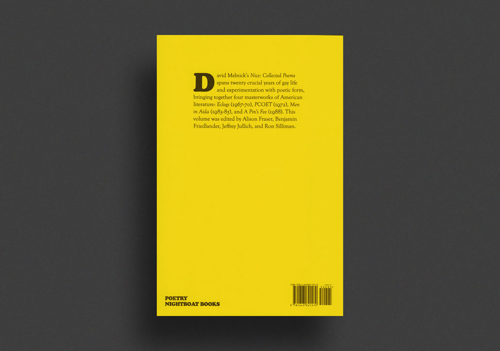 "Melnick's twist of "gay ethic" in poetic language makes for a brief but unforgettable oeuvre. Nice: Collected Poems proves that David Melnick is an exemplary figure of unreadability in American poetics, one who continues to teach us of unreadability's pleasures, politics, and pains. . . [T]he posthumous volume brings the once-hermetic Melnick out into the light of new audiences."—Gabriel Ojeda-Sague, Harriet