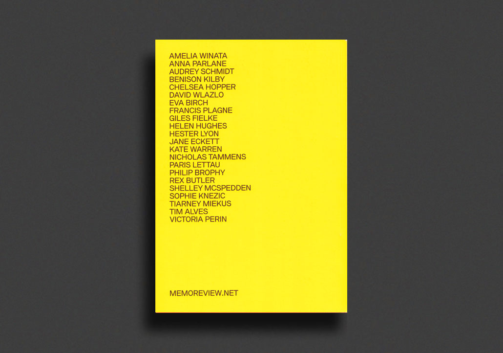 Contributions by Amelia Winata, Anna Parlane, Audrey Schmidt, Benison Kilby, Chelsea Hopper, David Wlazlo, Eva Birch, Francis Plagne, Giles Fielke, Helen Hughes, Hester Lyon, Jane Eckett, Kate Warren, Nicholas Tammens, Paris Lettau, Philip Brophy, Rex Butler, Shelley Mcspedden, Sophie Knezic, Tiarney Miekus, Tim Alves, Victoria Perin.