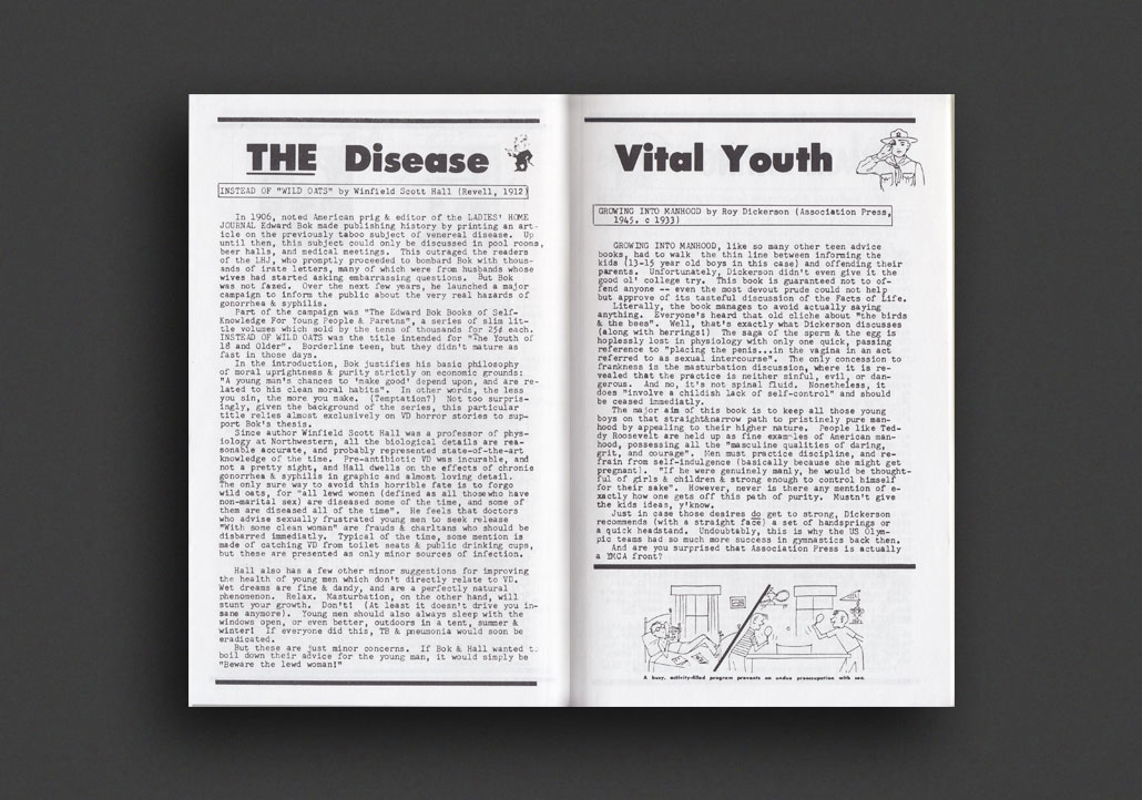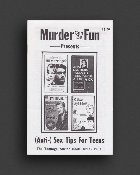 This Anti Sex Tips For Teens special one-shot publication "outgrowth" of Murder Can Be Fun is dedicated to Marr's collection of vintage Teenage Sex Advice books, 1897-1987, with commentary and excerpts from misguided advice manuals published for adolescents, from Victorian times to the near-present. "They're mindless. They're pointless. They're patronizing. They dish out bad advice on irrelevant topics for a world that never existed. [...] Boy, do I love them!"