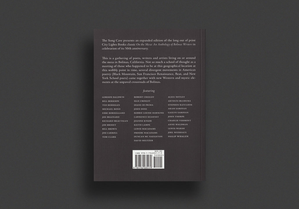 The Song Cave presents an expanded edition of the long out of print City Lights Books classic ON THE MESA: AN ANTHOLOGY OF BOLINAS WRITING in celebration of its 50th anniversary. This is a gathering of poets, writers and artists living on or around the mesa in Bolinas, California. Not so much a school of thought as a meeting of those who happened to be at this geographical location at this wobbly point in time, several divergent movements in American poetry (Black Mountain, San Francisco Renaissance, Beat, and New York School poets) came together with new Western and mystic elements at the unpaved crossroads of Bolinas.
