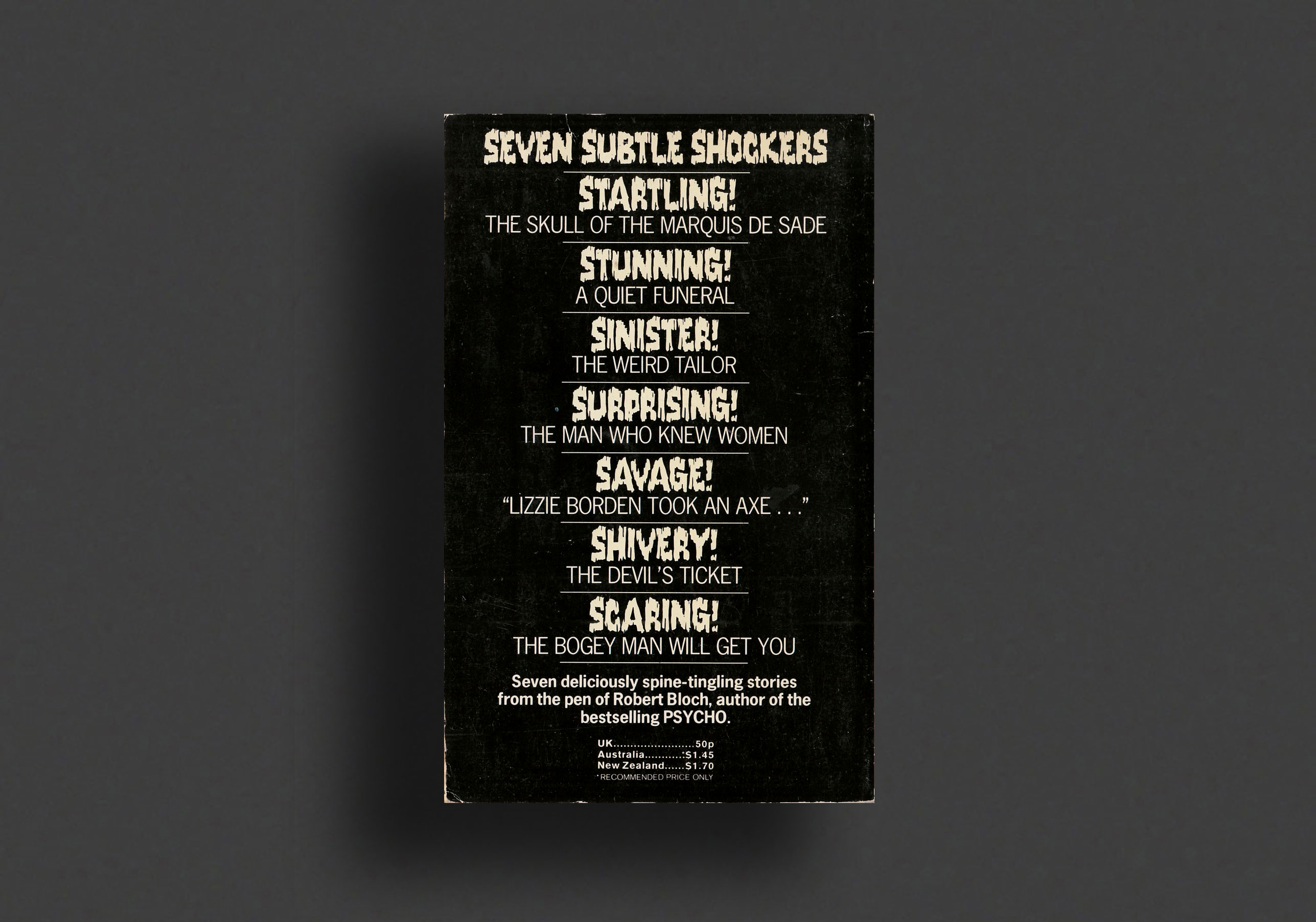 Scarce Corgi UK 1976 paperback edition of The Skull of The Marquis de Sade, a collection of short stories by author Robert Bloch, master of the monstrous. This story collection contains: The Skull of the Marquis de Sade; A Quiet Funeral; The Weird Tailor; The Man Who Knew Women; Lizzie Borden Took an Axe.; The Devil's Ticket; and The Bogey Man Will Get You.