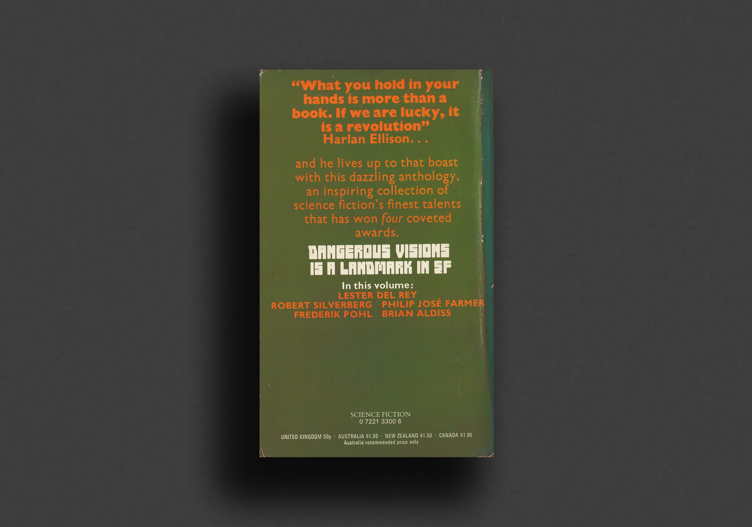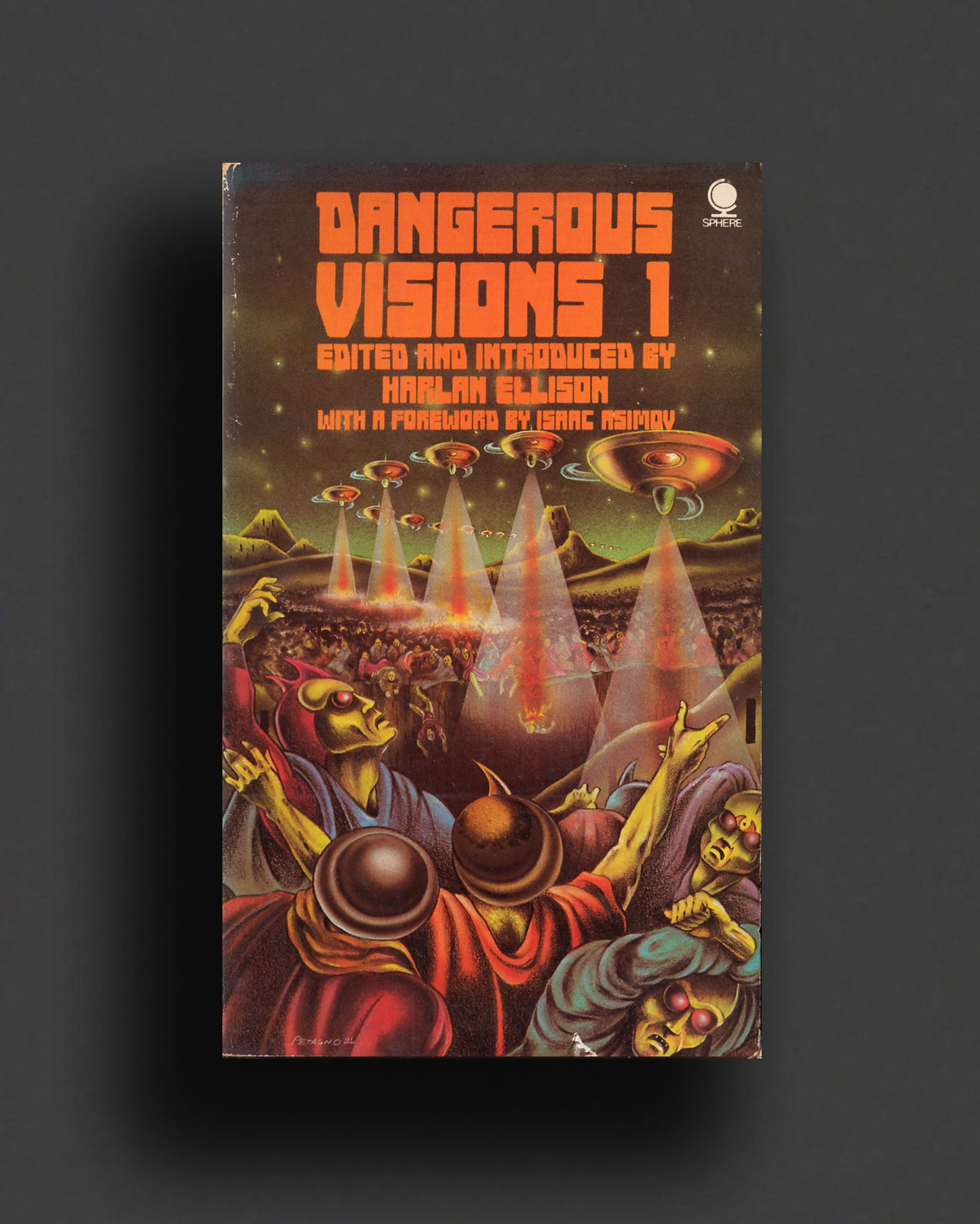 First 1973 Sphere volume of DANGEROUS VISIONS, a landmark science fiction short story anthology, edited by American author Harlan Ellison and illustrated by Leo and Diane Dillon. It was first published in 1967 and contained 33 stories, none of which had been previously published. A path-breaking collection, Dangerous Visions helped define the New Wave science fiction movement, particularly in its depiction of sex in science fiction. Writer/editor Al Sarrantonio wrote that Dangerous Visions "almost single-handedly [...] changed the way readers thought about science fiction." Contributors to the volume included 20 authors who had won, or would win, a Hugo, Nebula, World Fantasy, or BSFA award, and 16 with multiple such awards. Ellison introduced the anthology both collectively and individually while authors provided afterwords to their own stories.
