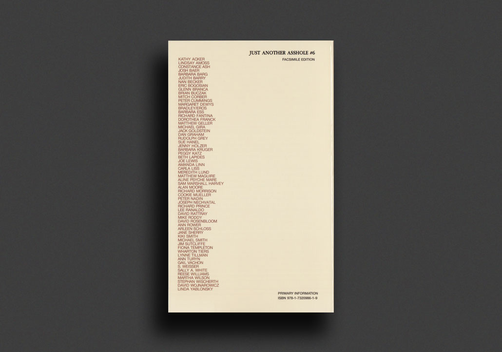 Just Another Asshole was an influential and now-legendary mixed-media publication series edited by Barbara Ess from 1978 to 1987. The submission process was open and collaborative, and each issue was produced in a different format (e.g., limited-edition zine by Ess, tabloid-sized graphic arts magazine, 4 pages in an issue of Artforum, photography book, LP record album, paperback book). Several were edited with Jane Sherry or Glenn Branca.