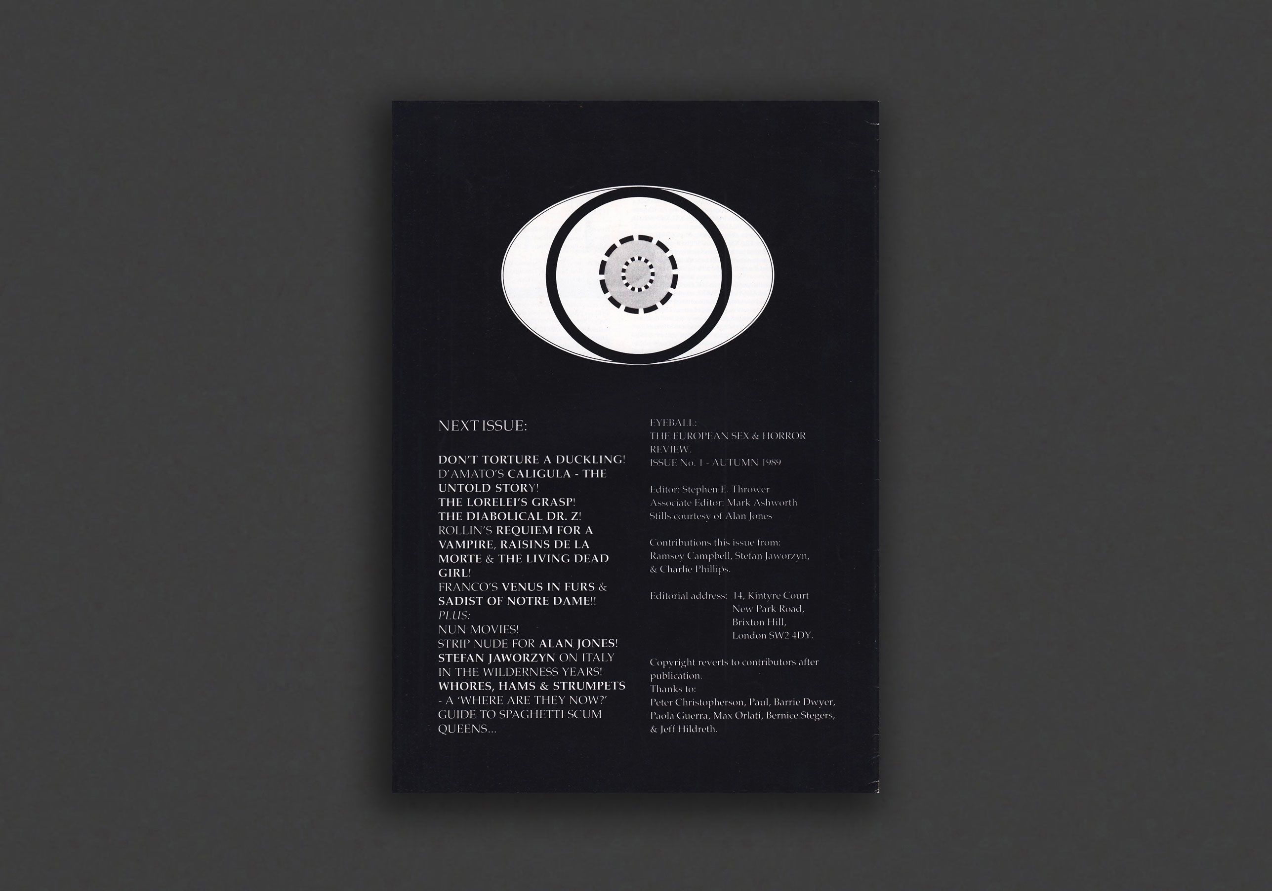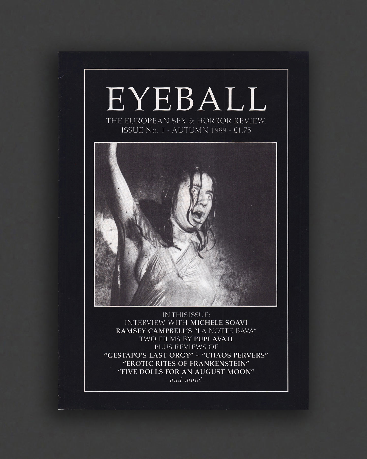Inaugural Autumn 1989 issue of Eyeball fanzine, "The European Sex & Horror Review", edited by Stephen Thrower with contributions from by Shock Xpress editor and Skullflower/Ascension guitarist Stefan Jaworzyn, Ramsey Campbell, Mark Ashworth, and Charlie Phillips. Features interview with Italian horror director Michele Soavi (Stage Fright, The Church, Cemetery Man, etc.), legendary horror author Ramsey Campbell's "La Notte Bava", Two Films By Pupi Avati (giallo masterpieces, The House with Laughing Windows and Zeder), plus reviews of "Gestapo's Last Orgy", "Chaos Pervers", "Erotic Rites Of Frankenstein", "Five Dolls For An August Moon" and more!