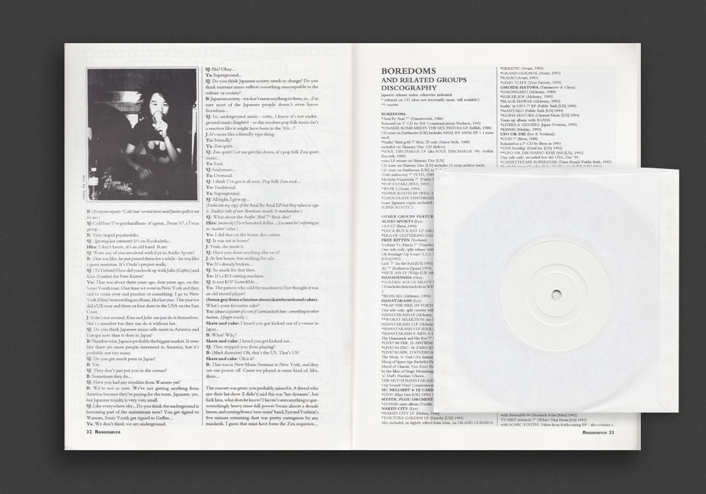 Rare "Special Japanese Issue" (Volume 4 No.2) of Resonance magazine, published by the London Musician's Collective in 1996 with exclusive 7" single of seven untitled pieces by Otomo Yoshihide and Yamatsuka Eye, recorded live in London, Spring 1995. Magazine includes articles by Otomo Yoshihide on the 1970s Japanese improvised scene (Kaoru Abe, Masayuki Takayanagi, Keiji Hano, et al.), Thurston Moore on Japan, Chris Cutler (Henry Cow, Recommended Records, et al.) on Haniwa Chan, Richard Scott on Hôgaku (Traditional Japanese Music), Steve Beresford (Derek Bailey's Company, et al.) on The Honeymoons, David Toop, Boredoms interview by Stefan Jaworzyn (including a Boredoms discography and family tree), Eckhart Derschmidt on Japanese jazz, Stefan Jaworzyn interviews Derek Bailey about working in Japan, live and record reviews and much more.