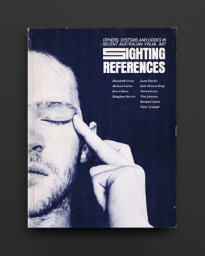 Very scarce Australian catalogue published on the occasion of the great exhibition "Sighting References: Ciphers, Systems and Codes in Recent Australian Visual Art" held in 1987 as a collaborative venture between Artspace Sydney and the Art Gallery of NSW and curated by Gary Sangster. This exhibition presents 'a range of sites of art production and reception', addressing the exhibition as a discursive and creative conjunction of (written and visual) information. Features the work of Juan Davila, Julie Brown-Rrap, Maria Kozic, Tim Johnson, Richard Dunn, Peter Tyndall, alongside essays by Elizabeth Grosz, Michael Carter, Ross Gibson, Meaghan Morris.