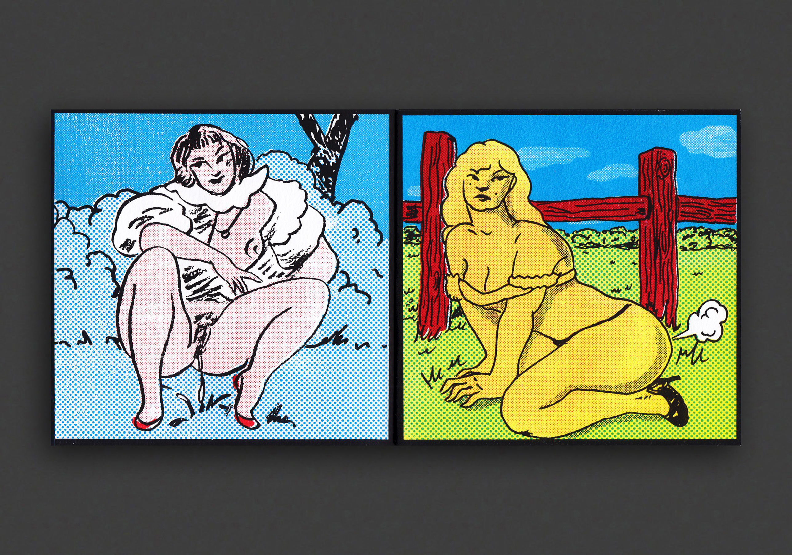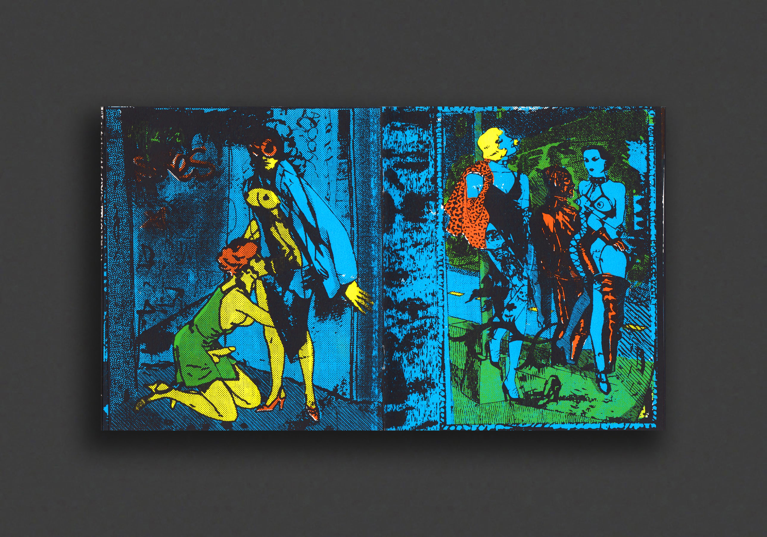 "A homage to the golden age of comics, this screen printed publication is an exercise of drawing and half-toning in colour, formatted like a comic panel. Like a lot of my work these pages are scenes of love, kink, femininity, and something other."—Oriette Wood