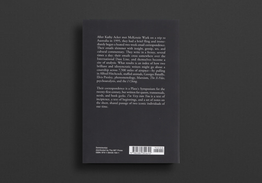 After Kathy Acker met McKenzie Wark on a trip to Australia in 1995, they had a brief fling and immediately began a heated two-week email correspondence. Their emails shimmer with insight, gossip, sex, and cultural commentary. They write in a frenzy, several times a day; their emails cross somewhere over the International Date Line, and themselves become a site of analysis. What results is an index of how two brilliant and idiosyncratic writers might go about a courtship across 7,500 miles of airspace—by pulling in Alfred Hitchcock, stuffed animals, Georges Bataille, Elvis Presley, phenomenology, Marxism, The X-files, psychoanalysis, and the I Ching.