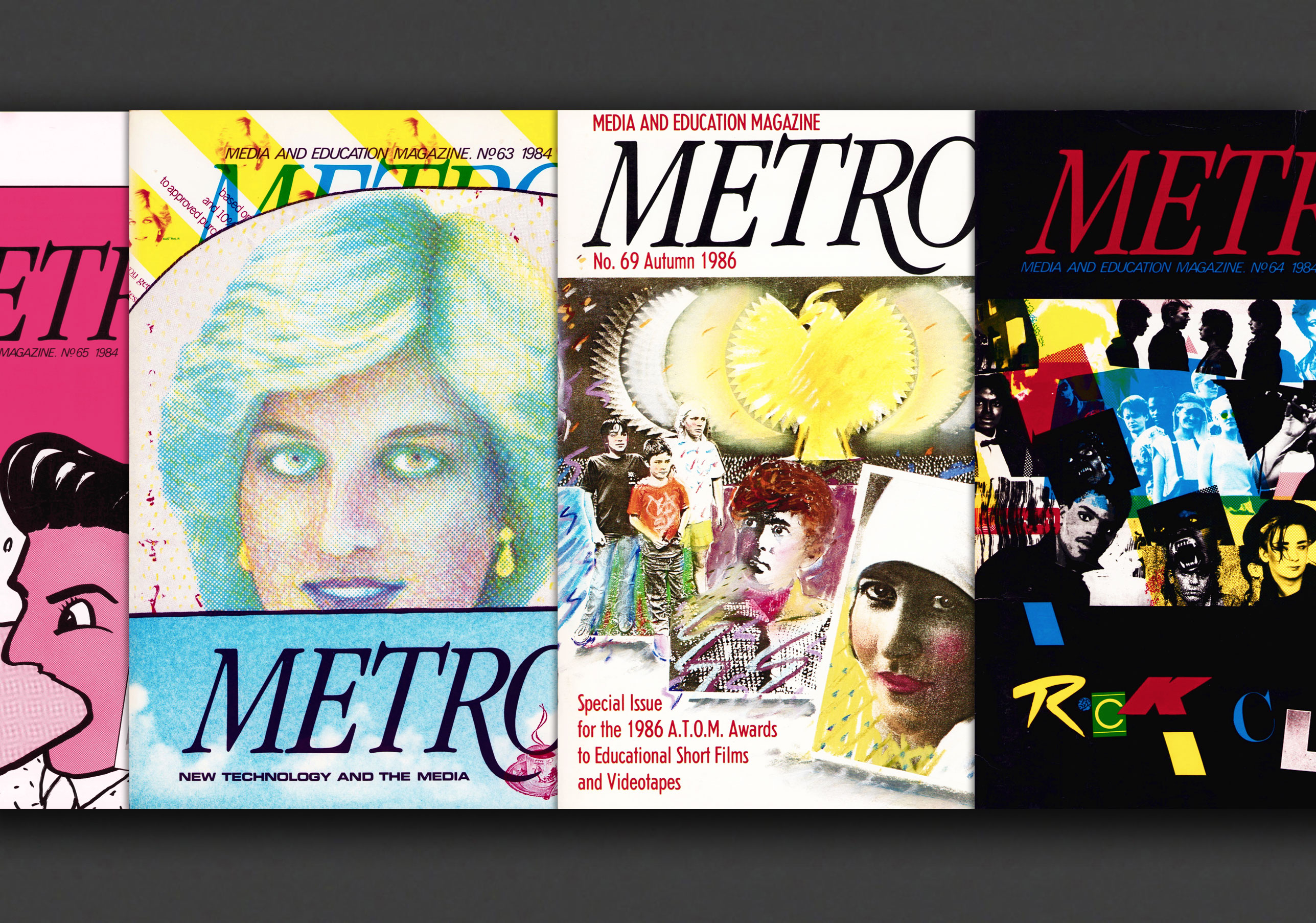 Lot of 4 early 1980's issues of Metro, Australia’s oldest film and media periodical. Founded in 1964 Metro is devoted to critical discourse on Australian screen culture. Includes Issue No. 63 (1984), Issue No. 64 (1984), Issue No. 65 (1984), Issue No. 69 (Autumn 1986), in the old over-sized, stapled format with excellent cover graphics and heavily illustrated throughout. With the subtitle "Media and Education Magazine", Metro was published at the time by the Australian Teachers of Media (A.T.O.M.) with assistance from the Australian Film Commission. Each issue packed with content on Australian film, video art, music videos, film history, film theory, film teaching, film industry, reviews, etc. School kids to Skinheads.