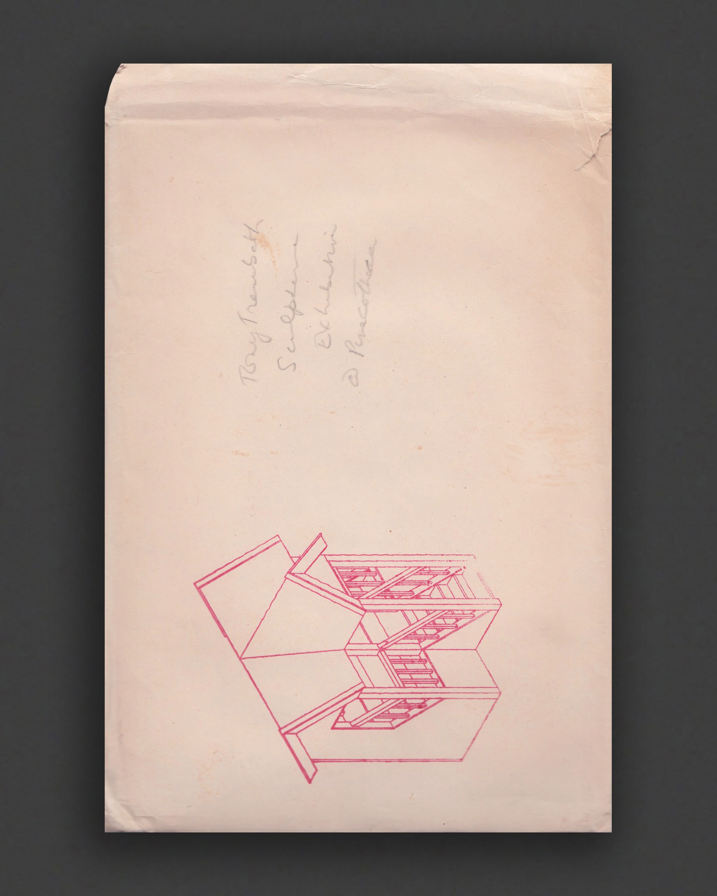 Very rare artist print edition published on the occasion of Tony Trembath's exhibition "Sculpture" at Pinacotheca, Melbourne, 1980. An incredibly intricate edition that reflects Trembath's humorous and conceptually rigorous practice, masterfully printed by Larry Rawling in his legendary Mal Studios printmaking workshop in Melbourne, 1980. Tri-fold 2-colour screen-printed card housing three silver envelopes containing folded exhibition invitation, folded work-list surveying three major sculptural installation/conceptual photography works spanning 1978-1980, and 20 die-cut architectural print works by the artist, all housed in stamped/hand-titled envelope.