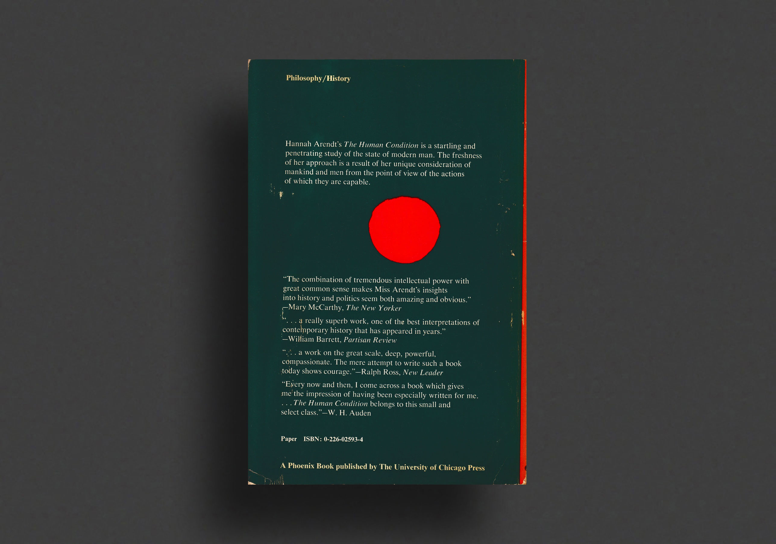 First 1958 paperback edition, 1985 print of Hannah Arendt's "The Human Condition", published by the University of Chicago Press. A work of striking originality, The Human Condition is in many respects more relevant now than when it first appeared in 1958. In her study of the state of modern humanity, Hannah Arendt considers humankind from the perspective of the actions of which it is capable. The problems Arendt identified then—diminishing human agency and political freedom, the paradox that as human powers increase through technological and humanistic inquiry, we are less equipped to control the consequences of our actions—continue to confront us today.