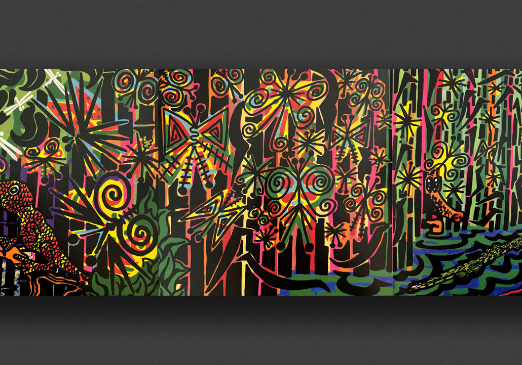 Born in Sète, France, Hervé Di Rosa (b. 1959) is a French painter who brings to life unique characters who populate his work in the form of paintings, sculptures, installations and animations. His style is similar to that of American artists Haring, Basquiat, Scharf and incorporates influences from graffiti and comic books. Di Rosa is a key figure in the "Figuration Libre" movement of French painters. His work is often humorous and brash and shows his passion for kitsch or "Art Modeste." In 2000, Di Rosa built a Museum dedicated to Modest Art in Sète, France.