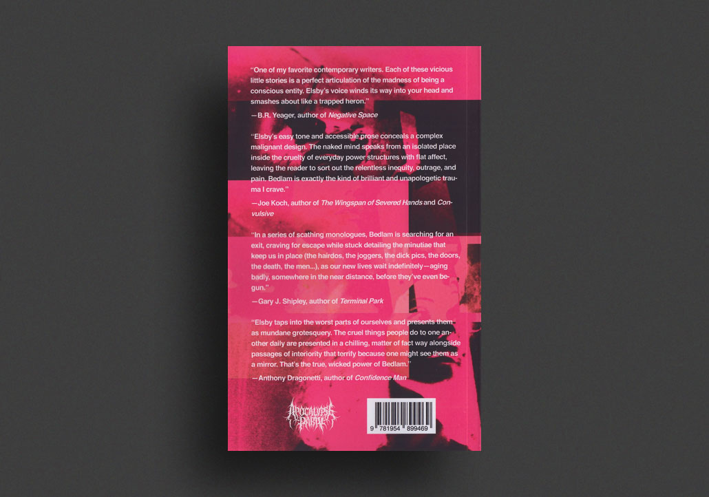 "Elsby taps into the worst parts of ourselves and presents them as mundane grotesquery. The cruel things people do to one another daily are presented in a chilling, matter of fact way alongside passages of interiority that terrify because one might see them as a mirror. That's the true, wicked power of Bedlam."—Anthony Dragonetti, author of Confidence Man