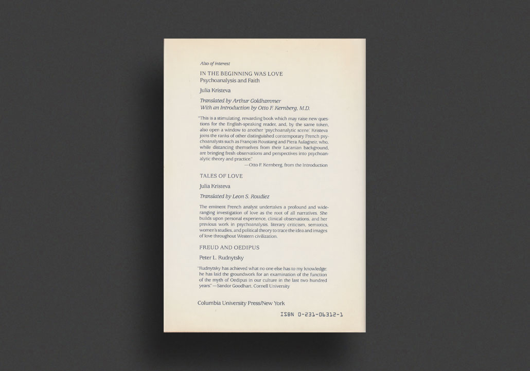 First edition from 1989 of Kristeva's Tales of Love, wherein her analysis deals with the role of narcissism and idealization in the formation of a love object. She accounts for the role of the death drive by coining the term "love/hate."