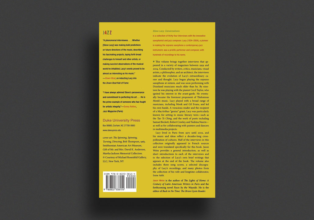 This volume brings together interviews that appeared in a variety of magazines between 1959 and 2004. Conducted by writers, critics, musicians, visual artists, a philosopher, and an architect, the interviews indicate the evolution of Lacy’s extraordinary career and thought. Lacy began playing the soprano saxophone at sixteen, and was soon performing with Dixieland musicians much older than he. By nineteen he was playing with the pianist Cecil Taylor, who ignited his interest in the avant-garde. He eventually became the foremost proponent of Thelonious Monk’s music. Lacy played with a broad range of musicians, including Monk and Gil Evans, and led his own bands. A voracious reader and the recipient of a MacArthur “genius” grant, Lacy was particularly known for setting to music literary texts—such as the Tao Te Ching, and the work of poets including Samuel Beckett, Robert Creeley, and Taslima Nasrin—as well as for collaborating with painters and dancers in multimedia projects.