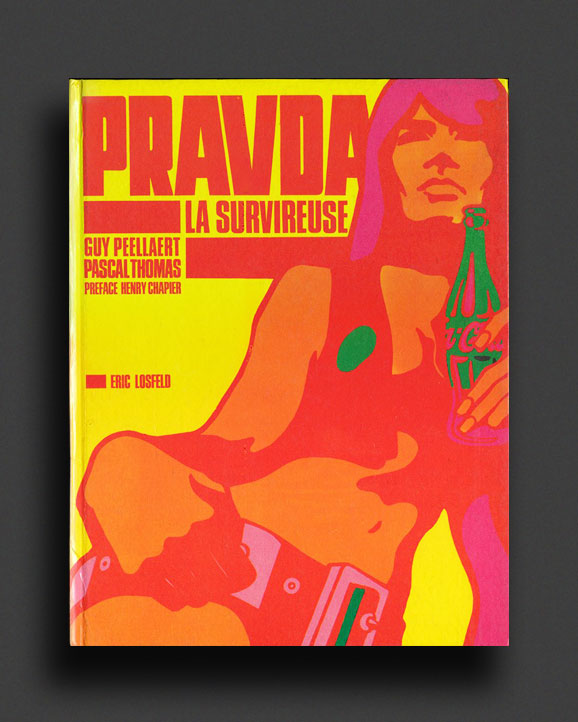 First hardcover edition of the iconic "Pravda la Survireuse" (Pravda the Overdriver) by Guy Peellaert (artist and writer), Pascal Thomas (writer) and Eric Losfeld (publisher) in 1968. Belgian advertising illustrator Guy Peellaert was one of the first to fully capture the vitality of Pop Art in his early adult graphic books, melding the bold compositional skills of a pop draftsman with a unique sensitivity to the comics medium, influenced by the music, art, and film of the time. His first comic, Les Aventures de Jodelle, (Jodelle's likeness based after yé-yé chanteuse Sylvie Vartan) appeared in 1966, swiftly followed by 'Pravda la Survireuse' (her visage modelled after Françoise Hardy) serialised for the magazine 'Hara-Kiri' (the precessor of Charlie-Hebdo) in 1967. Pravda is a leather-clad, Coca-cola drinking, panther/motorcycle riding Amazonian whose adventures take place in a surrealistic Mad Max meets Mister Freedom-like, futuristic international landscape, inhabited by degenerates, Authoritarians, beatniks, creeps and fascists. Pravda was first collected as a graphic novel by the great Belgian publisher Eric Losfeld in 1968, who had previously published Jean-Claude Forest's Barbarella in 1964 Philippe Druillet's Lone Sloane and Guy Pellaert's Jodelle. Pravda became a cult classic that remains unsurpassed to this day.