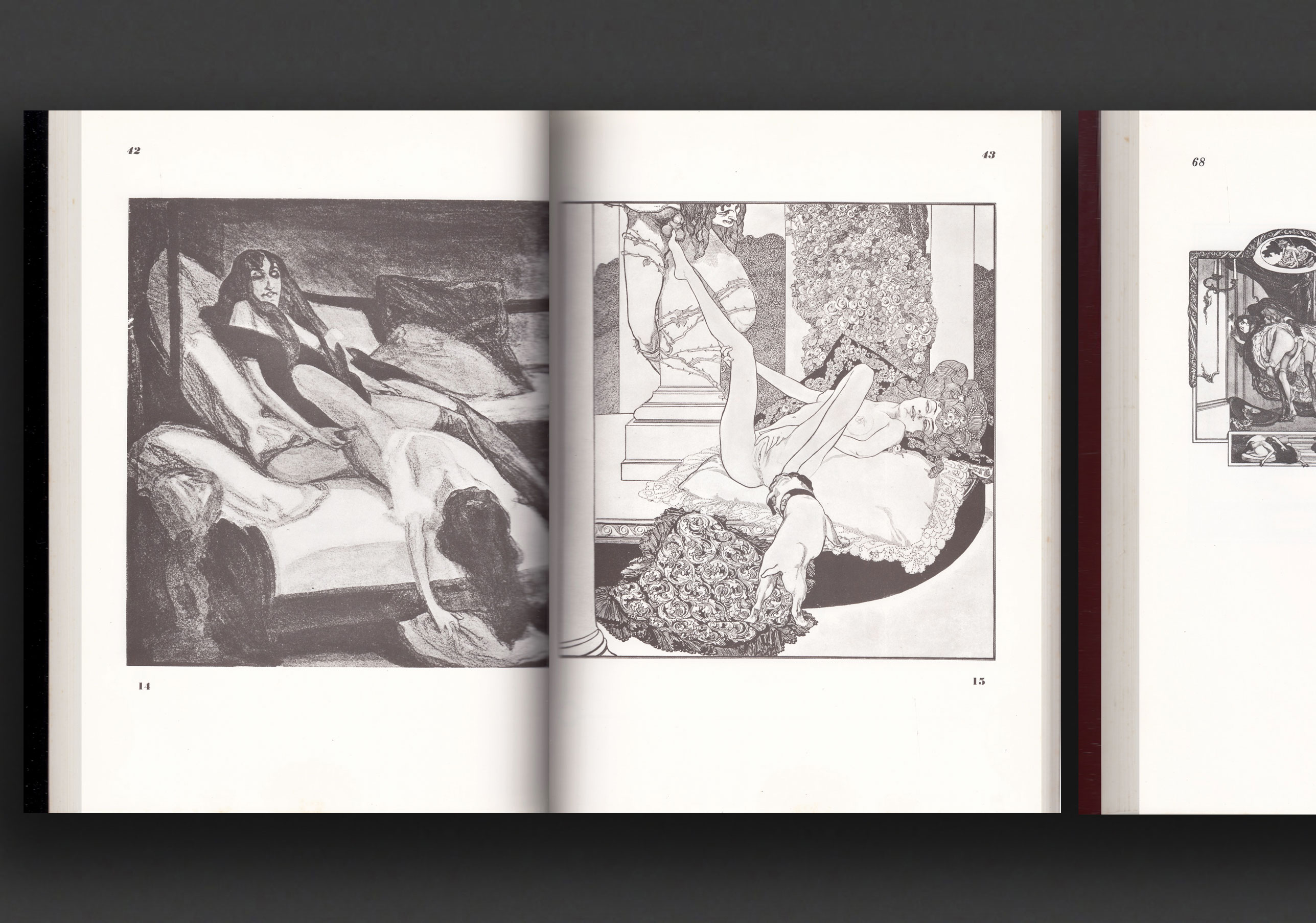 During his prolific period creating erotic works for limited edition collector's portfolios and rare book prints, Franz Von Bayros created illlustrations for Fleurettens Purpurschnecke (1905), Die Memoiren der Fanny Hill (1906), La Bohème (1906), Im Garten der Aphrodite (In the Garden of Aphrodite) (1907), Les Cent Nouvelles (1907), Die Grenouillère (1907), Die hübsche Andalusierin (1907), Manon Lescaut and the Chevalier des Grieux (1911), Erzählungen am Toilettentische (1911), Le Decameron (1911), amongst many more, as well as a brilliant array of ex-libris bookplate illustration.