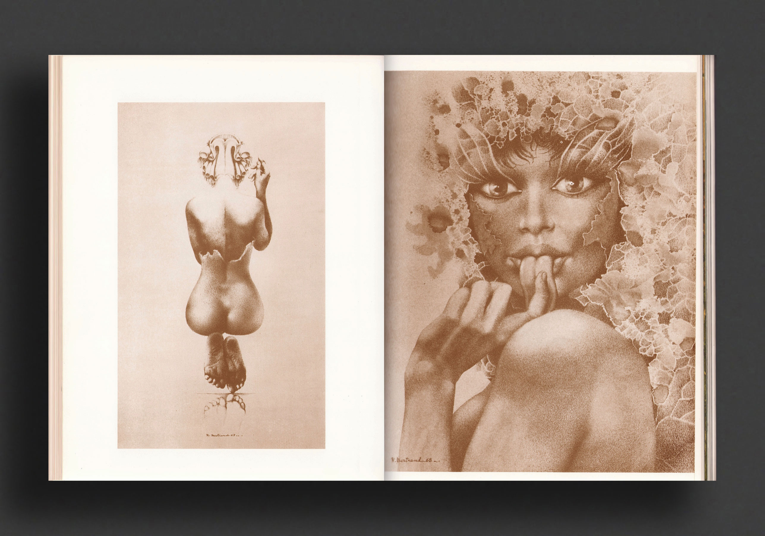 "This beautiful volume presents a comprehensive selection of the drawings and paintings of a contemporary French artist whose sensuous fantasy and surrealistic obsession have paid homage to the female body in a series of works which has no equal in modern art. 'The body,' says Emmanuelle Arsan in her introduction, 'is beautiful only if it is invented.' In this collection of drawings and paintings, Raymond Bertrand invents a female unlike any ever beheld by human eyes." (from dust jacket)