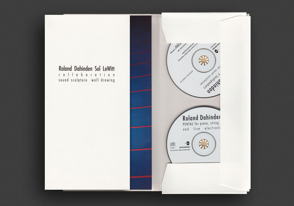 Scarce copy of Roland Dahinden, Sol LeWitt — Collaboration (Sound Sculpture Wall Drawing), a deluxe clothbound 2 x CD and book set published by Extraplatte and Steirischer Herbst, Austria. Commissioned by steirischer herbst 97, Kuppelsaal, Landesmuseum Joanneum, A-8010 Graz, Austria, 5.10. - 3.12. 1997. Includes the works: 1-1 PENTAS For Piano, String 4 And Live Electronics (Robert Höldrich, Tetras Streichquartett, Hildegard Kleeb, Gerhard Hüttl) 52:23; 2-1 PENTAS For 5 Loudspeakers (Remix Of The Sound Installation) (Dimitrios Polisoidis, Robert Höldrich) 1:00:12; Sol LeWitt — wall drawing #832 — Irregular red and blue special. Packaged in a cloth-bound hardcover folder/case, containing the two CDs and book with bi-lingual English/German liner notes. A folded image of Sol Lewitt's wall drawing is glued onto the inner side of the front cover.