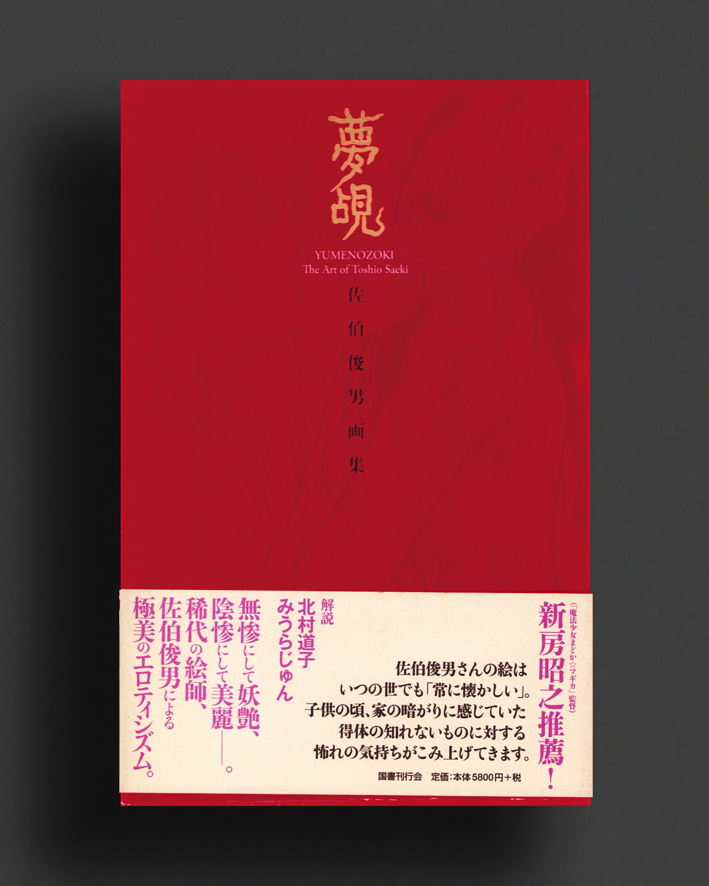 Now very rare out-of-print collection, and hands-down one of the best, "Yumenozoki (Glimpse of a Dream), The Art of Toshio Saeki" collects over 150 vividly coloured works of bewitching cruelty and gruesome beauty by Toshio Saeki, all of which were originally published in cult underground fetish magazine SM Select, between 1972—1984. Published only in Japanese in this hardcover and slipcased edition, includes two bilingual essays (Japanese / English) by Michiko Kitamura and Jun Miura, biography, and complete listing of artworks with original publication dates. An incredible volume of these important artworks that made Saeki a master in the Tokyo underground publishing scene, seen for the first time together, scaled-up and exquisitely reproduced in all their ero-guro glory. Highly recommended. First edition.