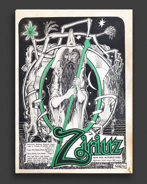 Scarce copy of the second issue of Ziriuz, "Australia's New Age Alternatives Monthly" newspaper. Published monthly in Frankston, Ziriuz was packed with articles on subjects from the stars and the soil — eco-activism, witchcraft, astrology, organic gardening, accompanied by illustrations and amazing period adverts from 1970's back-to-the-earth Victoria. This issue featuring interview with yogi Brahma Kumaris Janki, skin health, Aquarius, Yoga, cooking with grains, organic gardening, moon herbs, Austrian moor muds, eye exercises, the ills of sodium chloride (salt), vegetarian future food, "The Smog Game', healing, stories, astronomy, and much more!