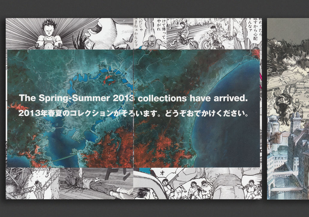 Copies of the infamous printed collaboration between Rei Kawakubo's Comme des Garçons and legendary manga artist Katsuhiro Otomo, best known as the creator of Akira, both the original 1982 manga series and the 1988 animated film adaptation. Issued as mail-outs privately by Comme to announce the arrival of their 2013—14 Autumn—Winter collection, and not commercially available, these gorgeous, elaborate leaflets designed by CDG founder Rei Kawakubo, showcase Otomo’s Akira artwork in a series of collages put together and coloured by Kawakubo herself, with fold-outs, inserts and die-cut illustrations have become highly desirable, for obvious reasons. Surprisingly Otomo is the first Japanese artist to feature in Comme’s mail outs, so this collaboration was very special for fans of both.
