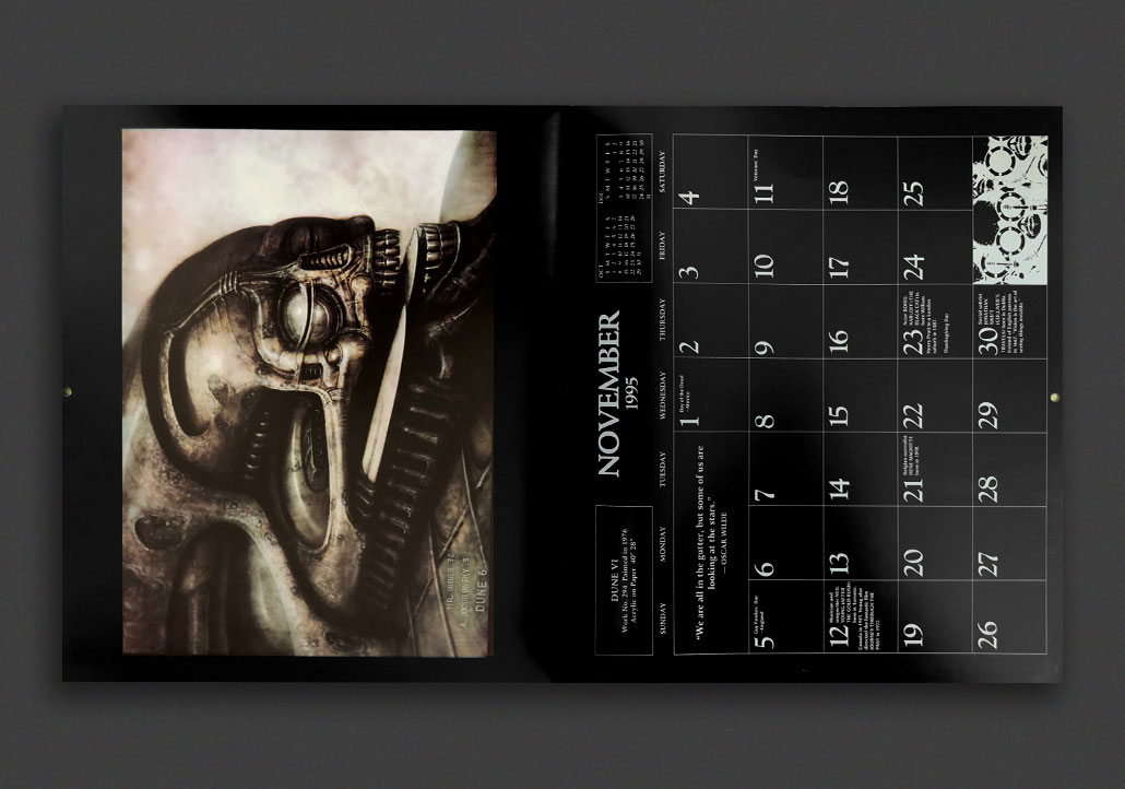 It was a good year, 1995, and with each month a new full-colour depiction of H.R. Giger's universe of the grotesque fantastic. 15 large-format reproductions, including never before published works, his hommage to Gustave Moreau, Biomechanoids and Biomechanical Landscapes, designs for the unreleased films "The Tourist" and "Dune" (by Jodorowsky). Unused copy ready for the wall.