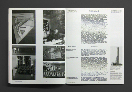 This issue of Pin-Up was entirely produced in their temporary office in the heart of Los Angeles. Features articles on Daniel Libeskind, Charles Renfro, Martino Gamper, MoMa’s architecture curator Barry Bergdoll, and an interview with Jacques Herzog. Essays by Payam Sharifi on Moscow’s Barrikadnaya apartment building, and by Paul Haacke on growing up along the Hudson River waterfront, entitled 'Meat Market Memories'.