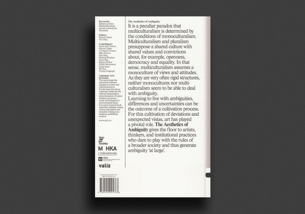 In The Aesthetics of Ambiguity: Understanding and Addressing Monoculture Pascal Gielen and Nav Haq argue that multiculturalism is paradoxically based on monocultural thinking. The publication explores this paradox by exploring monoculture in a variety of contemporary contexts. The book sets out to analyse monoculture using a multifaceted approach, by bringing together historical, social, cultural and ideological perspectives, using the dual role of art as tool for reconciliation and division in societies. The Aesthetics of Ambiguity gives stage to artists, thinkers and institutional practices who dare to play with the rules of a broader society and thus generate ambiguity ‘at large’. The book represents a quest for (more) ambiguity in order to avoid rigid borders or black-and-white polarities between cultures, as well as between practices of art and scientific thinking. By doing so, the artists, activists and researchers featured in this book plea for a politics and aesthetics of ambiguity to deal with the complexity of our living together on Earth.